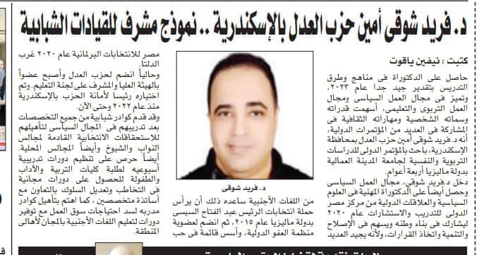 الصحافة الدولية تسلط الضوء على نشاطات د. فريد شوقي بالإسكندرية: دعم الكوادر الشابة ودمج ذوي الهمم في العمل السياسي