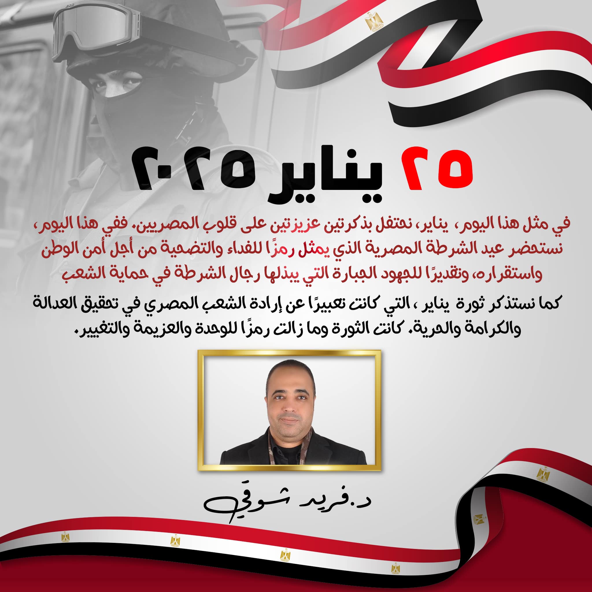 الدكتور فريد شوقي: 25 يناير يوم الفداء والوحدة.. ونستلهم منه دروس التضحية والتغيير